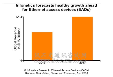 【訊石光通訊咨詢網(wǎng)】Infonetics研究近期發(fā)布了最新的以太網(wǎng)接入設(shè)備(Ethernet Access Device,EAD)市場報告。報告數(shù)據(jù)顯示,2012年全年,全球EAD市場增長3.5%至8.6億美元。該市場銷售收入增長放緩一方面是由于經(jīng)濟(jì)條件,另一方面則是由于2012年下半年運營商開支放緩。