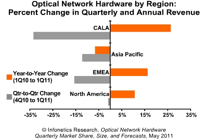 §2011年第一季度相比于2010年第四季度,全球光網(wǎng)絡(luò)設(shè)備市場,包括WDM和SDH/ SONET設(shè)備,面臨一個(gè)典型的季節(jié)性下降,下降了12%;