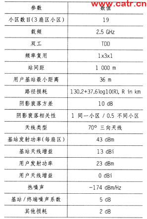 評估主要分為三個部分進行,第一部分是參數(shù)的設(shè)計,其中包括鏈路級信道調(diào)制編碼等所采用的技術(shù)和參數(shù)的設(shè)定,系統(tǒng)級功率控制、干擾計算等參數(shù)的設(shè)計。除此之外,我們還對傳播信道模型環(huán)境、業(yè)務(wù)模型和天線類型進行了規(guī)定。具體參數(shù)如表1~3所示。