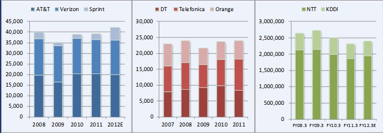 歐洲方面,2011三家運(yùn)營商資本開支相比2010年增長1.2%,因德國電信和法國電信合資采購設(shè)備,故資本開支有所下 滑。