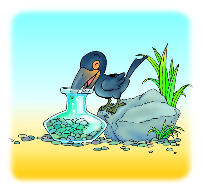 一只口喝的烏鴉在路邊發(fā)現(xiàn)了一個裝了半瓶水的長頸瓶。但瓶子牢牢地直立在干涸的泥土里,而且瓶口比較細而且很深,烏鴉的嘴巴根本夠不著。怎么辦?