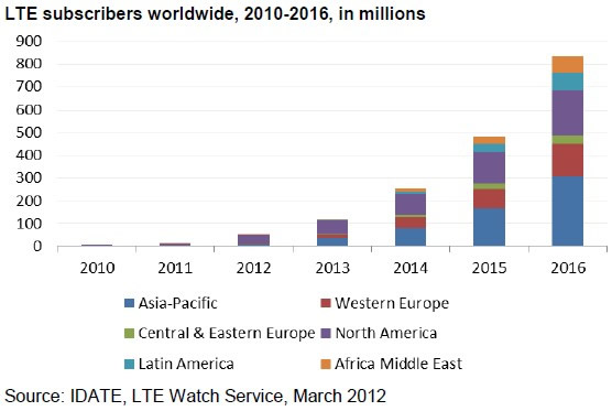繼2009年底在斯德哥爾摩由TeliaSonera率先發(fā)動和2010年第一次部署之后,2011年LTE得到加速發(fā)展。2011年底,超過900萬LTE用戶數(shù)雇傭超過30個全球網(wǎng)絡(luò),其中超過一半是美國Verizon無線客戶。4G生態(tài)系統(tǒng)正在迅速蔓延,超過200個移動運營商正在部署該技術(shù)。到2016年底,由于運營商在長期的演化和真正4G、LTE-Advanced上的興趣,全球LTE用戶數(shù)可能超過8億。由于中國和印度TD-LTE、日本、韓國的發(fā)展,亞太地區(qū)將伴隨著巨大增長潛力,而美國市場競爭則日益激烈,Clearwire,Sprint和Dish已經(jīng)選擇在LTE上大力投資,2013年將開始在LTE-Advanced上投資。4G在歐洲的應(yīng)用較慢,隨著數(shù)據(jù)流量的迅速增長,移動運營商的投資只能一步步來。