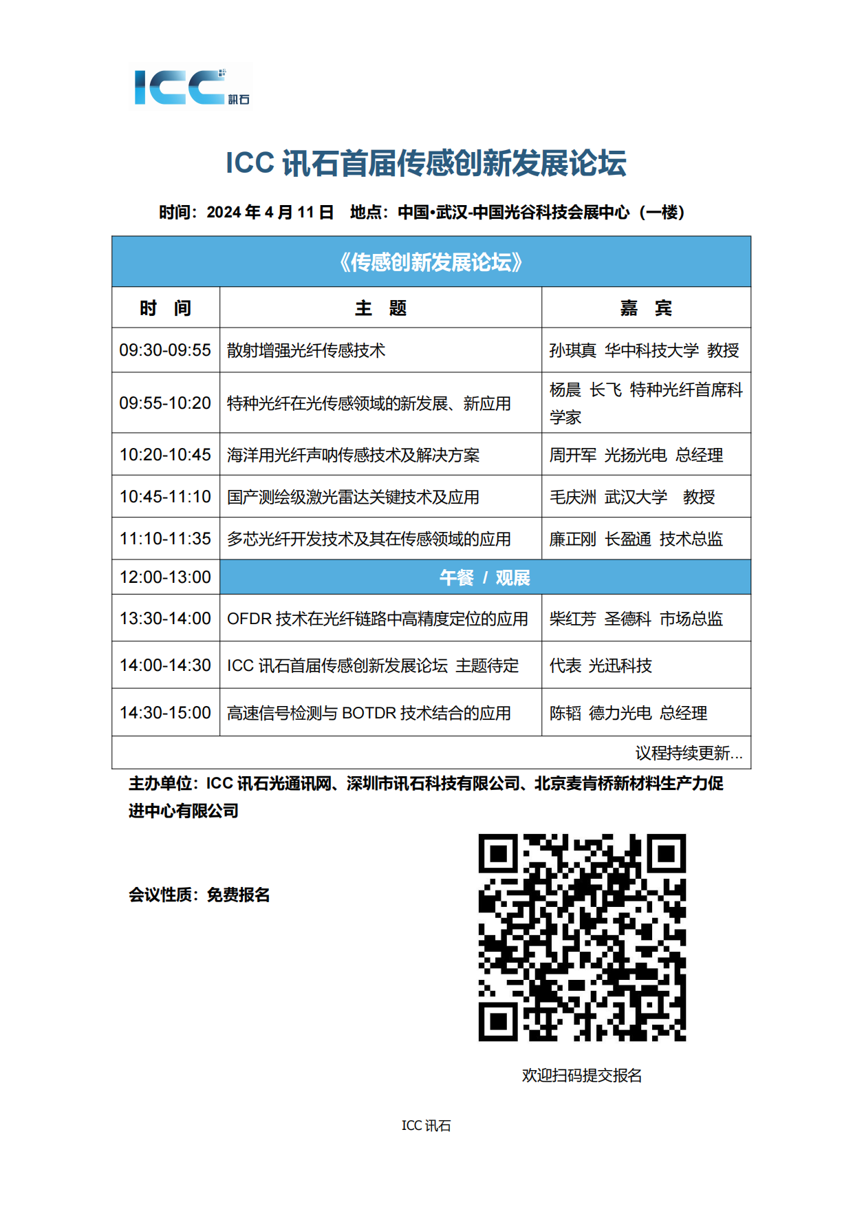 ICC訊 4月11日,由訊石公司、北京麥肯橋公司主辦的傳感創(chuàng)新發(fā)展論壇將在武漢中國光谷科技會展中心舉辦。本次訊石將邀請大學(xué)院校、研究院、傳感企業(yè)、測試設(shè)備企業(yè)共同參與,探討光纖傳感技術(shù)與市場的創(chuàng)新應(yīng)用與前景。