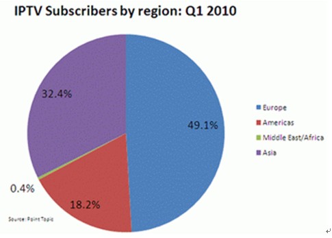 在2010年第一季度,中國電信超越了法國ISP Free,成為擁有最多IPTV用戶的供應商。亞洲則有成為全球IPTV用戶最多地區(qū)的潛力。