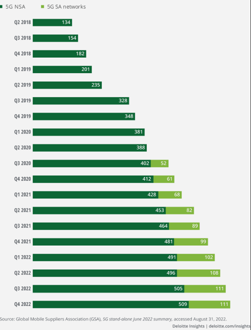 基于這一展望,德勤預(yù)計(jì)今年(2023年)投資5G SA網(wǎng)絡(luò)的移動(dòng)網(wǎng)絡(luò)運(yùn)營(yíng)商數(shù)量(包括試驗(yàn)、計(jì)劃部署或推出)將在2022年的100多家的基礎(chǔ)上翻一番,到2023年底至少增加到200家。