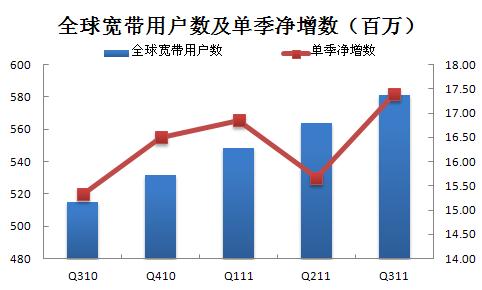 【訊石光通訊咨詢網(wǎng)】在經(jīng)歷了二季度的掙扎后,Q311全球?qū)拵в脩魧?shí)現(xiàn)了自2009年初以來最多的增長。截止Q311末,全球?qū)拵в脩魪腝211末的5.639億增長至5.813億,單季凈增數(shù)為1740萬,環(huán)比增長率為3.08%;相比Q310末,年增數(shù)為6640萬,年增幅為12.89%。