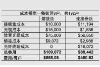 一個有192用戶的成本模型顯示:與傳統(tǒng)架構(gòu)相比,使用了MST和連接器的FTTP網(wǎng)絡(luò)可以使光纜成本降低85%(見表)。這主要是由于光纜費(fèi)用現(xiàn)在包括在了終端成本里。與此同時,拉光纖的費(fèi)用降低了大約25%,熔接的費(fèi)用降低了大約70%。事實(shí)上,盡管MST增加了業(yè)務(wù)終端的成本,但是以每戶計的總成本明顯比網(wǎng)絡(luò)配線低大約19%。