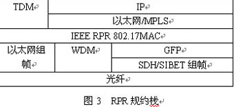 2000年11月IEEE 802.17工作組成立,目標是開發(fā)彈性分組環(huán)(RPR)標準,優(yōu)化在城域網(wǎng)拓撲環(huán)上的數(shù)據(jù)包傳輸;該技術結(jié)合以太網(wǎng)的實用性和SDH光傳輸設備的強大功能,利用空分復用,時分統(tǒng)計復用和保護環(huán)提高帶寬的利用率,實現(xiàn)了節(jié)點對網(wǎng)絡資源的合理利用,同時還支持業(yè)務分級(SLA),以及即插即用等特性,將城域網(wǎng)轉(zhuǎn)變?yōu)榭焖俸唵?,可靠,并及時提供豐富增值服務的寬帶網(wǎng)絡。圖3示RPR規(guī)約棧。由圖可見RPR通過在環(huán)網(wǎng)上的媒體接入控制(MAC)規(guī)約解決了城域網(wǎng)的現(xiàn)存問題;使其既有以太網(wǎng)低成本,有效和簡單的特性,又有SDH傳輸技術的高可用性,靈活性,以及50ms環(huán)路保護的優(yōu)點;為網(wǎng)絡提供一種新的傳輸技術;同時還能為不同的業(yè)務提供不同等級的QoS,滿足了建設城域網(wǎng)和廣域網(wǎng)對成本,性能以及維護管理的需要。