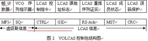 虛級聯(lián)VCAT和LCAS功能的實現(xiàn)都是通過同一個字節(jié)完成的。在VC-3/VC-4中采用H4字節(jié);由其構(gòu)成2個重復幀,第一個重復幀由16幀組成,第二個重復幀的長度為256幀。要完成一組VC控制信息的傳輸至少需要16幀,即2ms的時間。一個VCG最多由256個VC組成。