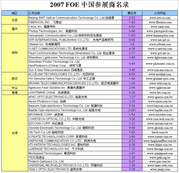 為方便客戶,訊石整理出一份2007 FOE 中國參展商名錄(包括大陸、香港及臺灣),供相關(guān)參展商及參觀者參考。