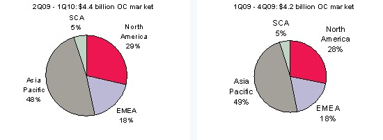 Ovum首次在市場占有率報告中納入?yún)^(qū)域分析預(yù)測——亞太區(qū)是成長最強(qiáng)勁的區(qū)域,占全球前四季營收的48%,部分原因來自代工制造商集中在這個區(qū)域。圖1顯示光學(xué)組件市場各區(qū)域的市場占有率。