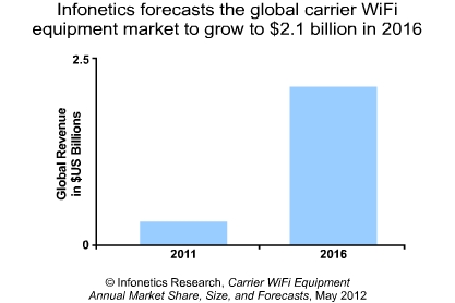Infonetics預(yù)測,全球運(yùn)營商WiFi設(shè)備市場將呈兩位數(shù)的高增長,到2016年爆增至21億美元。