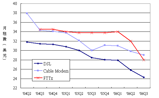 相較于2006年第二季,第三季DSL與Cable Modem的寬帶上網(wǎng)服務(wù)的價格下降趨緩,平均每月的月租費分別只降了2.5%及2.1%,下降的比例遠不如FTTx。分析師指出,在2006年初,DSL曾經(jīng)歷了最大幅度的費率降價,但目前降價幅度則趨緩,不過月租費仍是目前這三種上網(wǎng)方式里面最低的,目前全球平均費率依據(jù)購買力平價計算后為25美元,低于Cable Modem約4.5美元;而Cable Modem在第三季下降幅度過小,月租費率高過FTTx,讓Cable Modem失去了價格的競爭力。