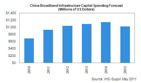 IHS iSuppli統(tǒng)計(jì),2010年中國(guó)寬帶資本支出是6.88億美元。未來(lái)3年,中國(guó)在該項(xiàng)投資上會(huì)繼續(xù)增長(zhǎng),直至2014年。但到2015年,隨著城鎮(zhèn)互聯(lián)網(wǎng)用戶的寬帶市場(chǎng)接近飽和,寬帶資本支出將下降到10.2億美元。