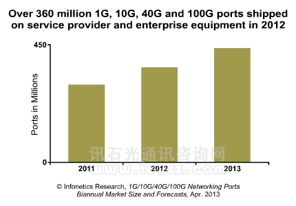 2012年1G,10G,40G和100G網(wǎng)絡(luò)端口出貨量(出貨給服務(wù)提供商和企業(yè)設(shè)備)較2011年增長(zhǎng)22%,高達(dá)3.6億。