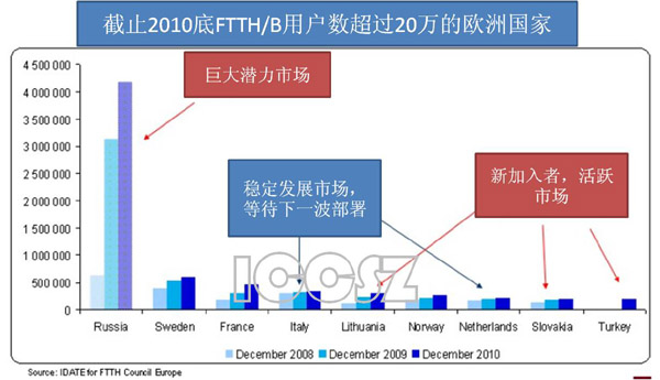 不過,目前在歐洲,住宅和商業(yè)用戶還不相信光纖到戶的好處,截止2010年底,滲透率(FTTH/B用戶所占家庭覆蓋率的比例)仍然非常低,只有17.5%。日本滲透率為39%,美國也達(dá)到了34%。