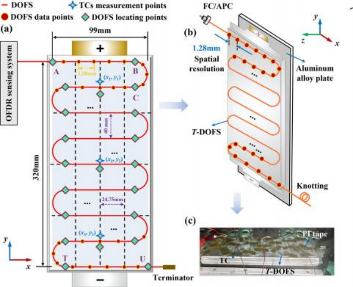 鋰離子電池在電動汽車與儲能系統(tǒng)中的規(guī)模化應(yīng)用,對熱管理安全性提出嚴苛要求。本文基于光頻域反射技術(shù)的分布式光纖傳感器(DOFS),通過螺旋--蛇形布線實現(xiàn)電池全表面溫度精準監(jiān)測,結(jié)合局部自適應(yīng)徑向基函數(shù)插值與不確定性量化方法,解決傳統(tǒng)傳感技術(shù)離散測量、信息缺失的痛點,為電池熱管理優(yōu)化提供可靠支撐。
