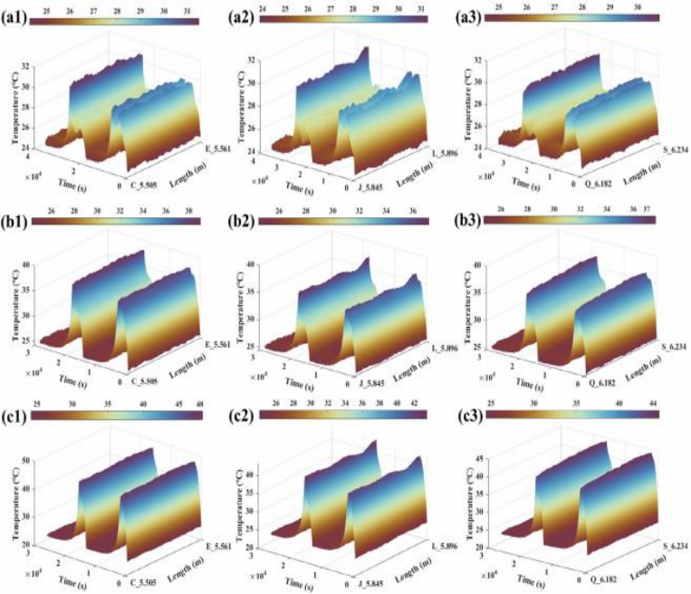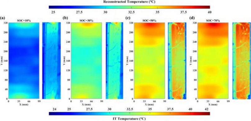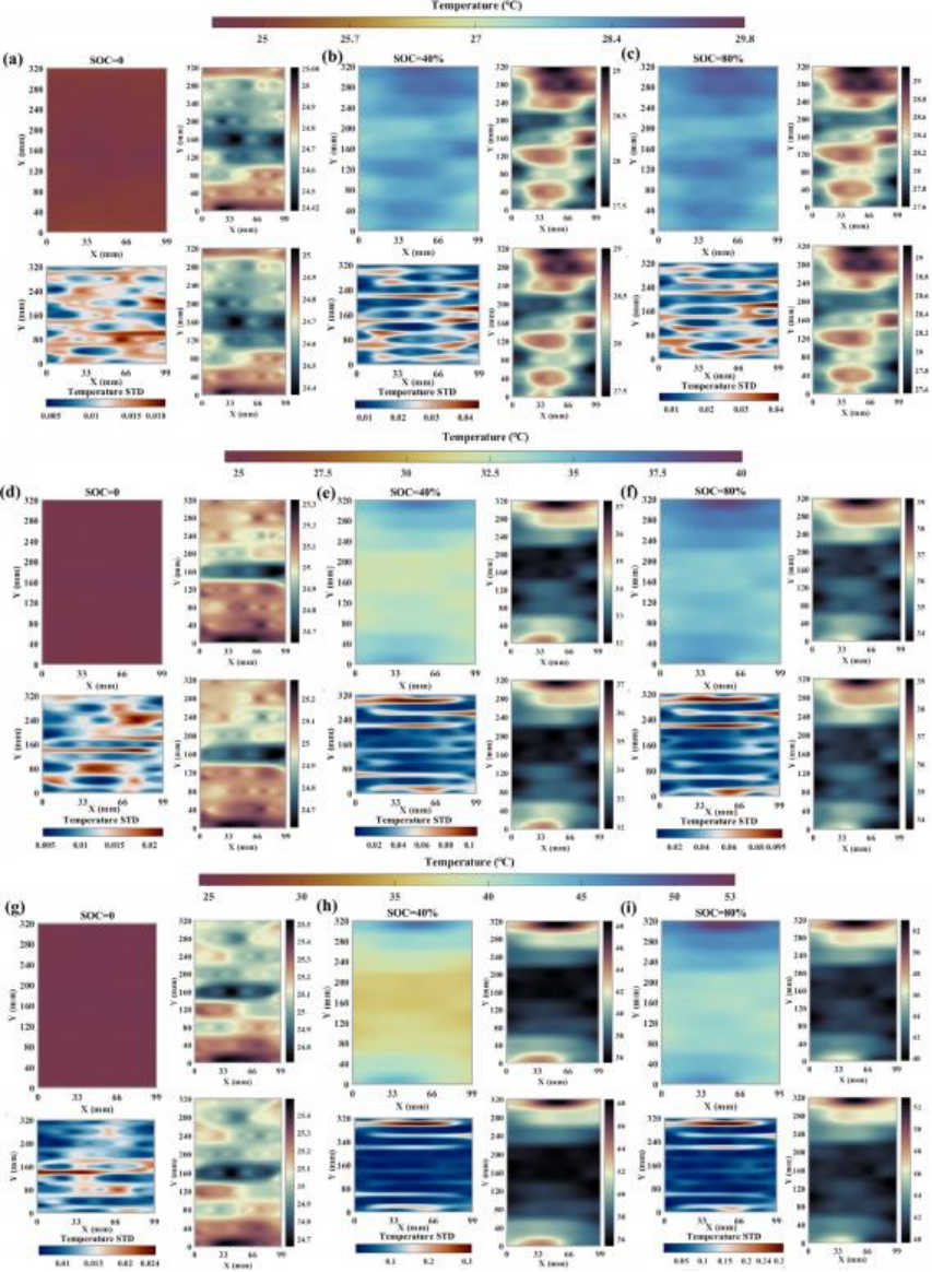 在實驗測試中,依托螺旋蛇形布置的T-DOFS及OFDR技術(shù),實現(xiàn)了對電池全表面的連續(xù)溫度監(jiān)測,其溫度測量精度達±0.1℃,空間分辨率可達1.28毫米;同時,借助空間映射方法和插值算法,成功完成了電池表面溫度分布的高保真精準重建,為電池熱管理工作提供了全面且詳實的溫度信息支撐。