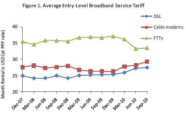 若不計入購買力平價影響, 自2009年12月開始, DSL以及Cable Modem平均價格呈現(xiàn)增長趨勢,但2010年第二季度有所例外,在該季度,兩種接入技術(shù)的寬帶價格都有所下降。