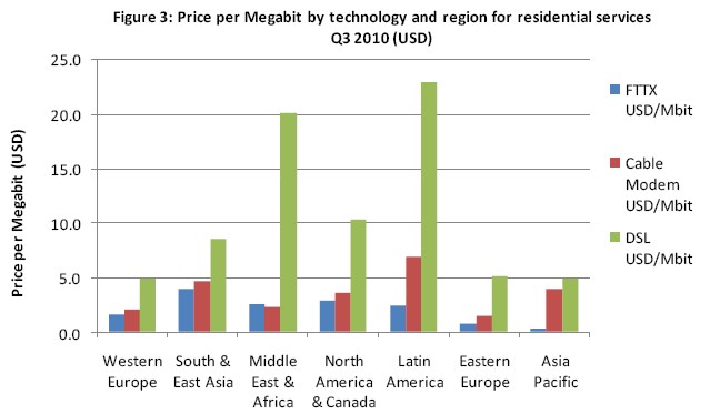 在2007年到2010年9月期間,三種不同的寬帶接入技術(shù)都經(jīng)歷了平均價格的急劇增長。 DSL仍是最便宜的接入技術(shù),其次是FTTx和Cable Modems。如果不計入PPP(購買力平價)影響,Cable Modemns接入價格自2007年底來第一次超過了FTTx,價格上漲主要是由于歐洲及亞洲地區(qū)運營商價格上升。