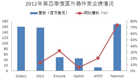 【訊石光通訊咨詢網(wǎng)】2012年第四季度國(guó)外器件商業(yè)績(jī)普遍向好,同環(huán)比差不多都實(shí)現(xiàn)了增長(zhǎng)。