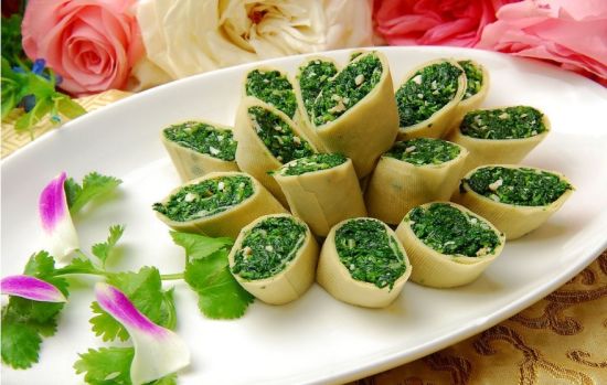 薺菜洗凈燒熟切成末,加炸熟的松仁、鹽、味精、麻油拌和,百頁一切二用滾水燙泡后冷開水激涼瀝干,攤放在潔凈的砧板上,一端放薺菜餡,卷成長卷,斜切成收裝碟。此菜明目、降壓。適用春季。