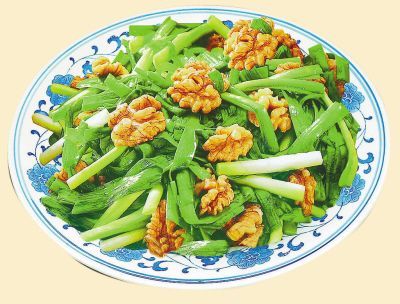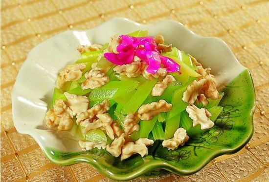 芹菜取嫩莖洗凈,入沸水鍋燙斷生,撈出用冷開水激涼瀝干,加鹽、味精、麻油拌和;核桃仁用麻油炒熟,放在芹菜上,食用吃拌用,此菜滋補(bǔ)肝腎、烏發(fā)、降血壓、適用春季。