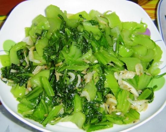 白菜心洗凈切成段,蝦皮3湯匙用水略沖洗。炒鍋上火,放油燒熱,加入蝦皮,適量蒜蓉,白菜心炒勻,炒至菜熟,不需調(diào)味即可上桌。此菜有開胃,潤肺的功效,其豐富的鈣,磷,蛋白質(zhì)及維生素對(duì)體弱乏力,腰酸足軟有一定的療效。秋冬,初春食用最佳。