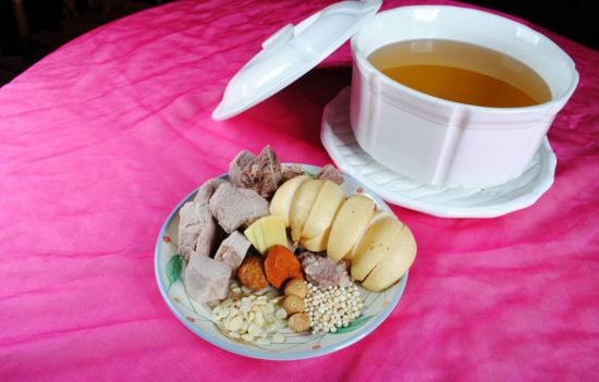 將川貝、雪梨去皮,切成1厘米的方塊;豬肺洗凈,擠去泡沫,切成長2厘米的塊。將川貝,豬肺,雪梨共置砂鍋內(nèi),加入冰糖,水適量,置武火上燒沸,用文火燉2小時(shí)即成。有除痰、潤肺、鎮(zhèn)咳等功效,還適用于老年人無痰熱咳等癥。