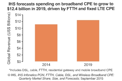 ICCSZ訊 近日市場調(diào)研公司IHS發(fā)布其最新的關(guān)于客戶駐地設(shè)備(CPE)市場報告,該報告分析了DSL、線纜、光纖到戶方面的市場信息。IHS預(yù)測該市場到2019年將增長8%,至124億美元。
