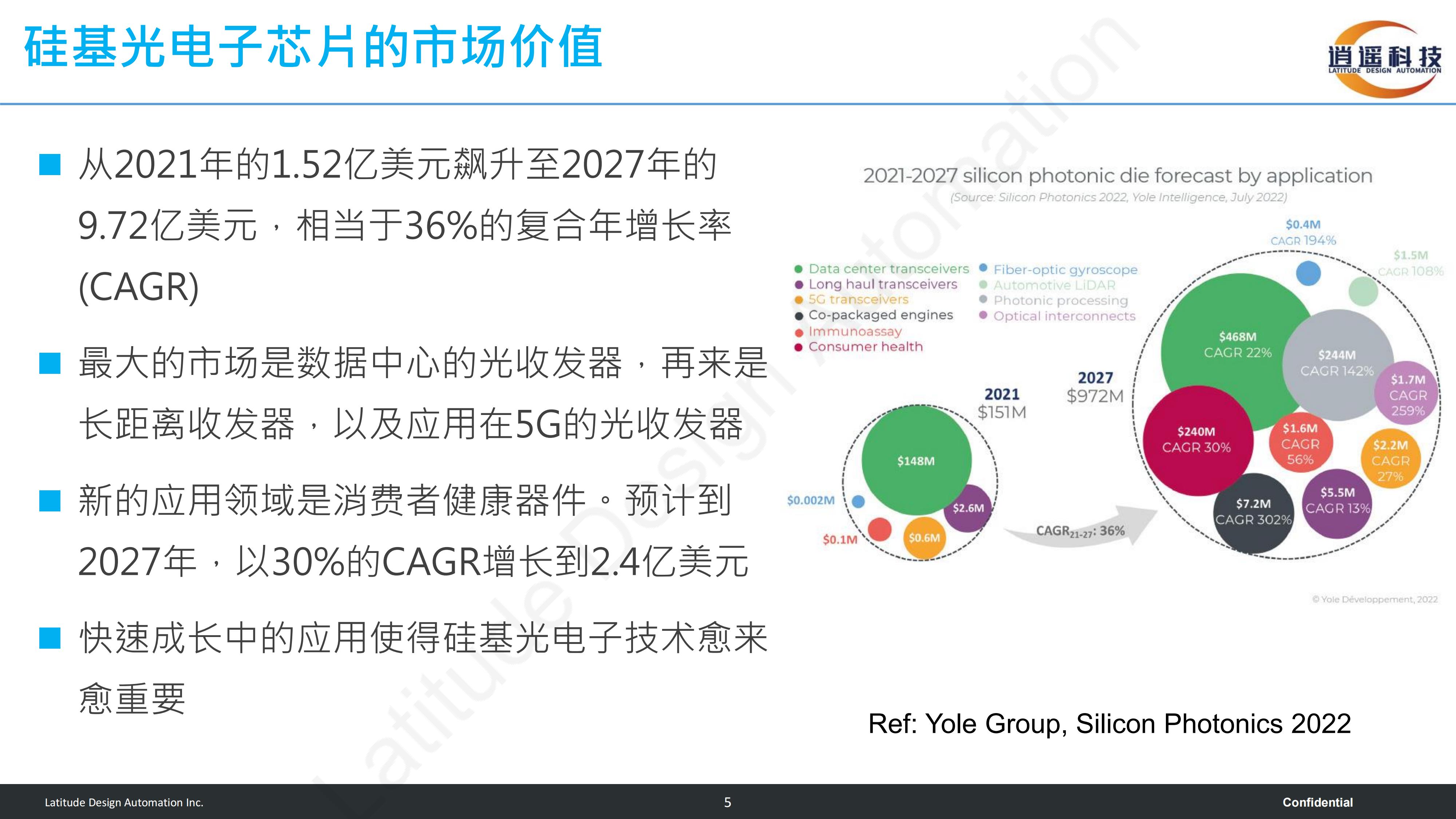 在本次演講中,談及硅基光電子芯片的市場價(jià)值,陳博士介紹道:從2021年的1.52億美元飆升至2027年的9.72億美元,相當(dāng)于36%的復(fù)合年增長率(CAGR)最大的市場是數(shù)據(jù)中心的光收發(fā)器,再來是長距離收發(fā)器,以及應(yīng)用在5G的光收發(fā)器新的應(yīng)用領(lǐng)域是消費(fèi)者健康器件。預(yù)計(jì)到2027年,以30%的CAGR增長到2.4億美元快速成長中的應(yīng)用使得硅基光電子技術(shù)愈來愈重要。