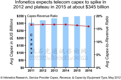 Infonetics預計2012全球資本開支將會飆升,在2015年或2016年升至3450億美元后趨于平穩(wěn)。
