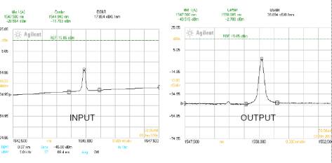 這樣就讓本地CW波長(zhǎng)與輸入信號(hào)波長(zhǎng)在干涉儀上產(chǎn)生了相長(zhǎng)干涉(constructive interference),從而導(dǎo)致輸入數(shù)據(jù)的波長(zhǎng)轉(zhuǎn)換,即從λ2轉(zhuǎn)變?yōu)棣?。由于本地CW具有很高的光譜純凈度,因此輸出光信噪比(OSNR)將得到有效改善,從一個(gè)受噪音影響的低OSNR輸入信號(hào)轉(zhuǎn)變成高信噪比的輸出信號(hào),這樣導(dǎo)致信號(hào)的光譜得到再整形,參看圖2。而波長(zhǎng)轉(zhuǎn)換和2R再生這兩項(xiàng)功能則是SOA-MZI的最主要應(yīng)用。