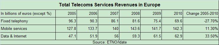目前ETNO還未有關(guān)于2011年的任何細(xì)節(jié),其報(bào)告(數(shù)據(jù)來(lái)自研究機(jī)構(gòu)Idate)顯示近年來(lái)固網(wǎng)部分收入一直下滑。如圖中所示,從2005到2010年間,固網(wǎng)語(yǔ)音收入下滑27.7%,而移動(dòng)收入增長(zhǎng)11.3%,數(shù)據(jù)業(yè)務(wù)收入增長(zhǎng)33.5%。