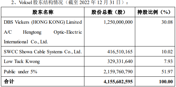 注:亨通光電國際有限公司是通過其股票經(jīng)紀(jì)人,即 DBS Vickers (Hong Kong) Limited A/C Client 持有 Voksel 30.08%的股份。