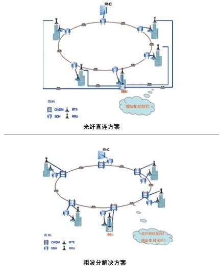 通常BBU和RRU間采用光纖直連承載,然而經(jīng)過分析,在BBU:RRU為1:N的應(yīng)用場景下,用粗波分設(shè)備組網(wǎng),以波長替代裸光纖將節(jié)省大量光纖資源,對(duì)2G網(wǎng)絡(luò)中已鋪設(shè)的光纖實(shí)現(xiàn)利舊復(fù)用,使網(wǎng)絡(luò)具有良好的擴(kuò)展性。此外,避免了在密集城區(qū)鋪設(shè)新光纜,保證網(wǎng)絡(luò)快速建設(shè)。圖2和圖3分別顯示了在宏基站、微基站應(yīng)用環(huán)境中,光纖直連及粗波分方案的應(yīng)用效果對(duì)比。