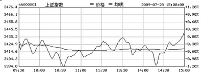 上證指數(shù)◆開盤3434.32點(diǎn) ◆最高3439.92點(diǎn) ◆漲幅0.09%◆收盤3438.37點(diǎn) ◆最低3392.43點(diǎn) ◆成交金額2467億元