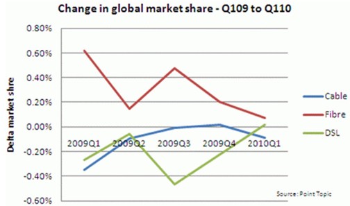 2010年第一季度是進(jìn)入2009年以來(lái)寬帶用戶(hù)數(shù)量增長(zhǎng)最快的一個(gè)季度,該季度增長(zhǎng)1470萬(wàn)線(xiàn),季度增長(zhǎng)3.12%。截止2010年3月31日,全球?qū)拵в脩?hù)數(shù)量達(dá)到了4.84億。Point Topic最新數(shù)據(jù)顯示.