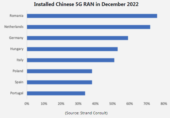在歐洲,德國(guó)也不是什么異類。Strand Consult的報(bào)告顯示,該地區(qū)的許多其他國(guó)家繼續(xù)從中國(guó)供應(yīng)商那里購(gòu)買產(chǎn)品,主要是華為。僅舉幾例,截至去年年底,他們?cè)谛傺览惭b的5G設(shè)備中所占份額為53%,意大利為51%,荷蘭為72%,波蘭為38%,葡萄牙為34%,羅馬尼亞為76%,西班牙為38%。