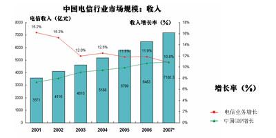 但是,經(jīng)過多年的持續(xù)高速發(fā)展,中國電信產(chǎn)業(yè)的發(fā)展近年來已經(jīng)呈現(xiàn)出逐漸放緩的態(tài)勢。從近年電信行業(yè)收入增長趨勢可以看出,電信業(yè)收入增長率正在逐年降低,已經(jīng)由2001年的16.8%下降到2006年的11.9%,從2007年前9個(gè)月的情況來看,2007年中國電信行業(yè)收入增長率降低到10.8%。根據(jù)溫家寶總理最近講話中的預(yù)測,2007年中國的GDP增長率將達(dá)到11.5%,也就是說,2007年的中國電信行業(yè)收入增長率很可能將在20年中首次低于中國GDP增長率。圖1為2001~2007年中國電信行業(yè)收入示意圖。