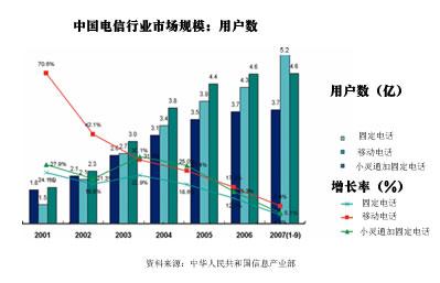 就手機(jī)用戶數(shù)來說,根據(jù)國際電聯(lián)的統(tǒng)計(jì),2006年全球手機(jī)用戶總數(shù)達(dá)到26.9億戶,增長率為23.7%,而中國手機(jī)用戶增長率已經(jīng)從2001年的70.6%降低到了2006年的17.3%,落后于世界平均增長率。值得一提的是,從2007年前9個(gè)月的情況來看,2007年中國手機(jī)用戶增長率約為8.4%,這個(gè)增長率也是20年以來首次低于GDP增長率。圖2為2001~2007年中國電信行業(yè)用戶數(shù)示意圖。