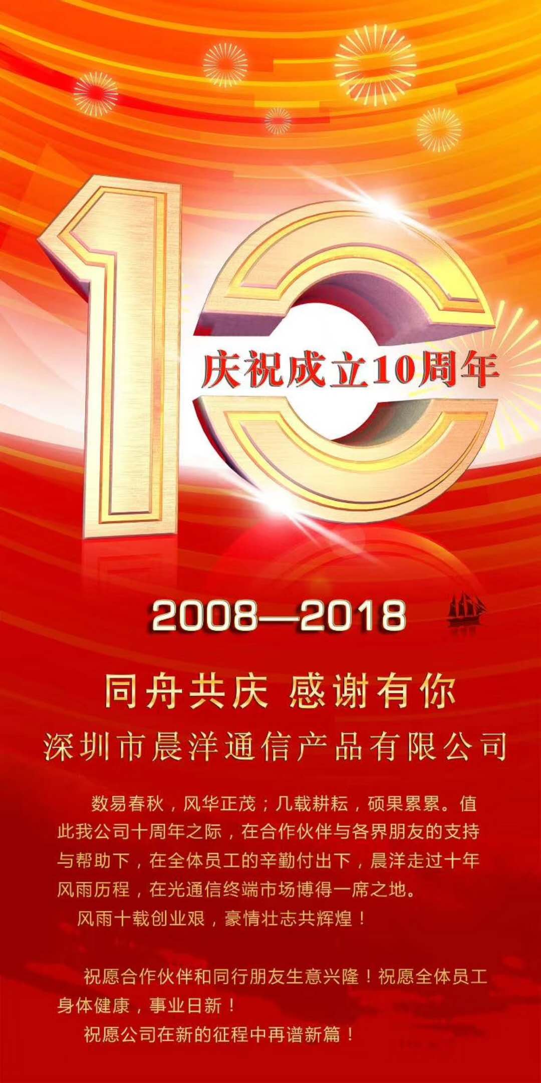 值此成立十周年之際,在合作伙伴與各界朋友的支持與幫助下,在全體員工的辛勤付出下,晨洋走過十年風(fēng)雨歷程,在光通信終端市場博得一席之地。