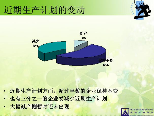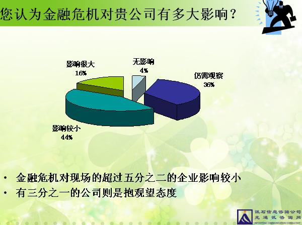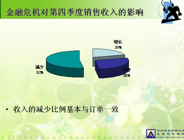 在訊石十一月“金融風暴專題”聯(lián)誼會中,我們針對“金融危機對光通訊行業(yè)的影響”這一主題進行了一個問卷調查,共有30多家企業(yè)的70多名來賓朋友接受了此次問卷調查。調查結果顯示:金融危機下,超過一半以上的企業(yè)訂單及收入都有所減少,但受影響程度并不大,所以企業(yè)目前關于生產(chǎn)及人事方面的計劃亦沒有發(fā)生很大變化。以下是問卷調查結果分析。