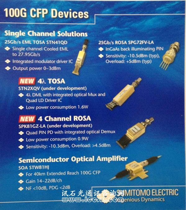 本屆展會(huì)上,展出100G相關(guān)產(chǎn)品的陣容強(qiáng)大的當(dāng)屬住友電工無(wú)疑了。住友電工的展臺(tái)號(hào)為404,展品有CFP/QSFP+ 產(chǎn)品涉及100G/40G CFP TOSA/ROSA及模塊,40G QSFP+ROSA及模塊,25Gb/s ROSA/TOSA。