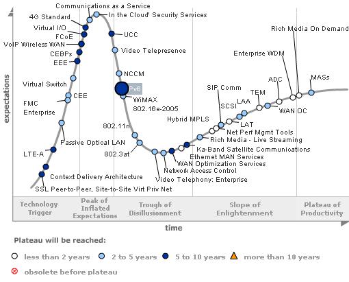 *此圖表為 Gartner2009 年發(fā)布的對(duì)于電信行業(yè)技術(shù)的評(píng)估曲線. 其中對(duì)于 IPv6 做了標(biāo)準(zhǔn)
