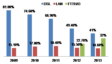ICCSZ訊 近年來隨著國家加大對電信基礎(chǔ)設(shè)施的建設(shè),我國電信業(yè)有了較大的發(fā)展,尤其是FTTH/O在2012年和2013年實現(xiàn)大幅度增長,從2012年互聯(lián)網(wǎng)寬帶接入端口技術(shù)比例為22.7%,到2013年提升到32%,而DSL則出現(xiàn)大幅度下降。