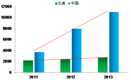 圖一表明我國光進銅退正在快速的進行中,而圖二則列出的是中國地區(qū)與北美地區(qū)FTTH覆蓋數(shù)對比情況:從2011年到2013年FTTH覆蓋數(shù)中國分別是北美地區(qū)的1.68倍、3.09倍和4.15倍。