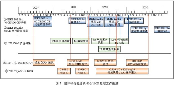 目前主要有ITU-T、IEEE和OIF 3個組織在進行40G和100G的相關標準化工作。ITU-T主要從光傳送網的角度對40G和100G技術進行規(guī)范;而IEEE主要從業(yè)務接口的角度規(guī)范40GE/100GE的接口參數(shù);OIF則主要關注于100G長途傳輸線路接口以及相關電接口的規(guī)范。