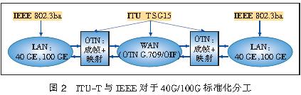 各主要國際標準化組織在40G/100G的標準化工作如圖1所示。ITU-T與IEEE對于40G/100G標準化分工如圖2所示。