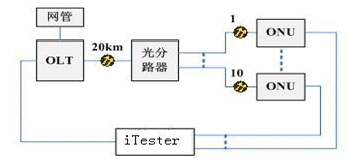參照上圖連接1個OLT和10個ONU,每個ONU僅提供一個端口連接至iTester網(wǎng)絡(luò)測試儀端口。OLT與光分路器之間接入20km盤纖。